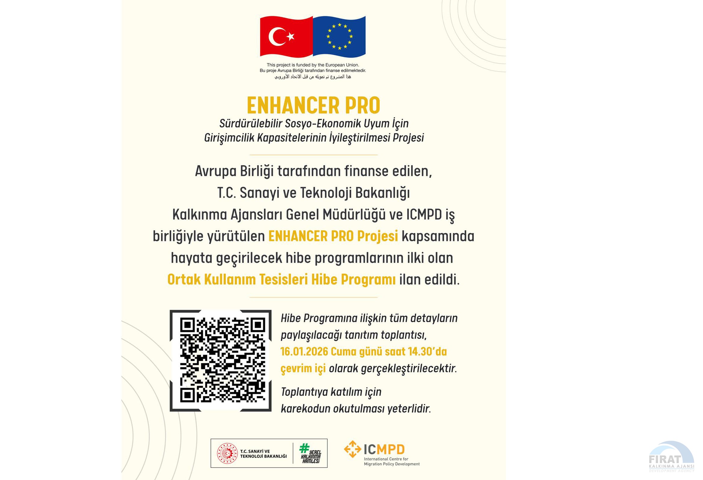 Avrupa Birliği tarafından finanse edilen ve T.C. Sanayi ve Teknoloji Bakanlığı Kalkınma Ajansları Genel Müdürlüğü ile ICMPD iş birliğinde yürütülen, Fırat Kalkınma Ajansı'nın iştiraklerinde Malatya ve Elazığ'da uygulanan ENHANCER PRO Projesi kapsamında, Ortak Kullanım Tesisleri Hibe Programı çağrısı 12 Ocak 2026 tarihi itibarıyla ICMPD’nin resmi portalında yayımlanmıştır.